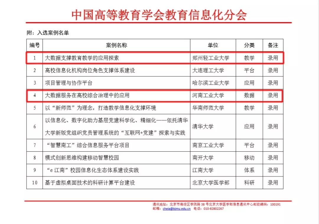 2019年11月,中国高等教育学会教育信息化分会公示《高等教育信息化创新应用案例集(第三辑)》,我省郑州轻工业大学、河南工业大学申报的《大数据支撑教育教学的应用探索》《大数据服务在高校综合治理中的应用》成功入选,分别位列第一、第四。